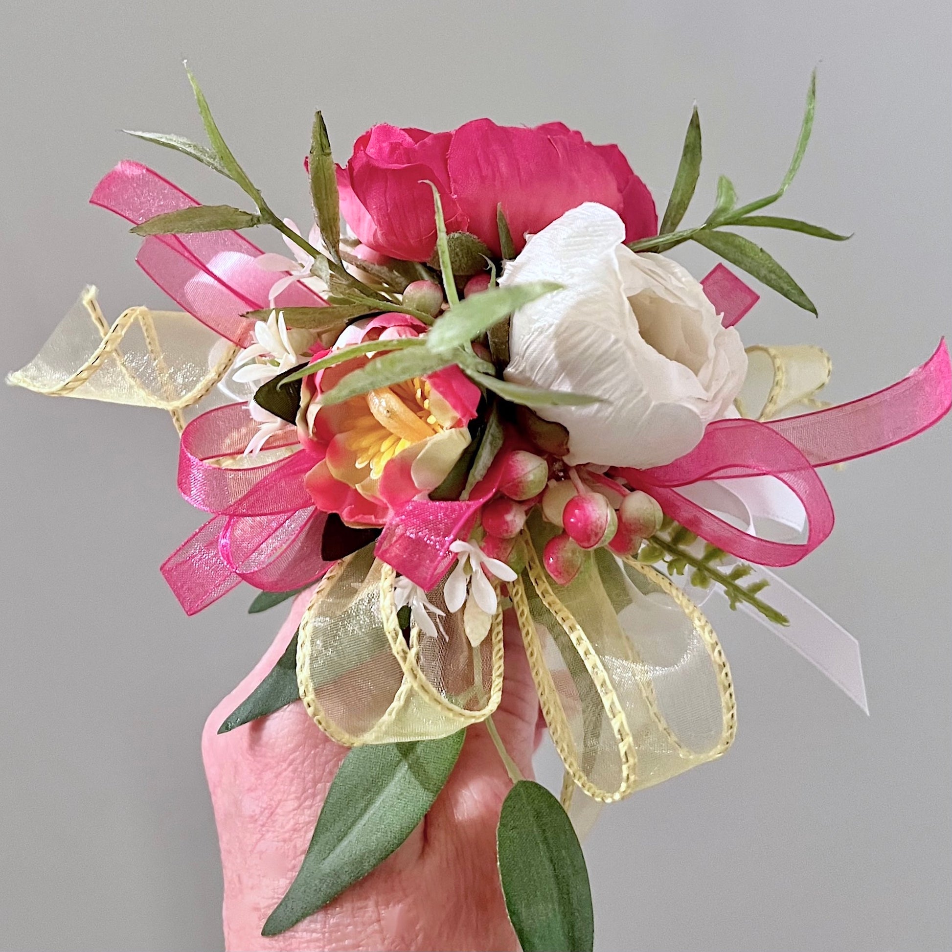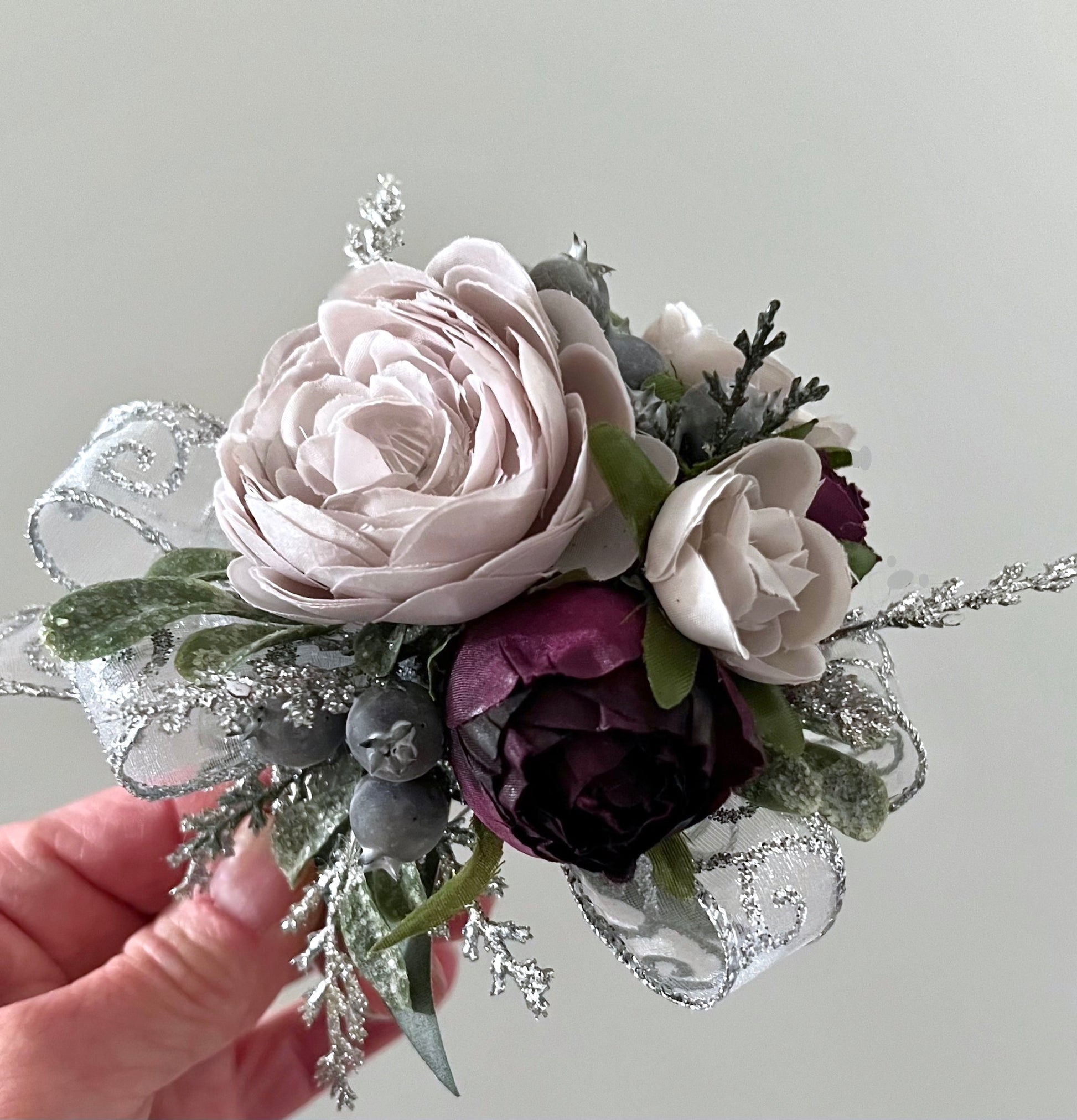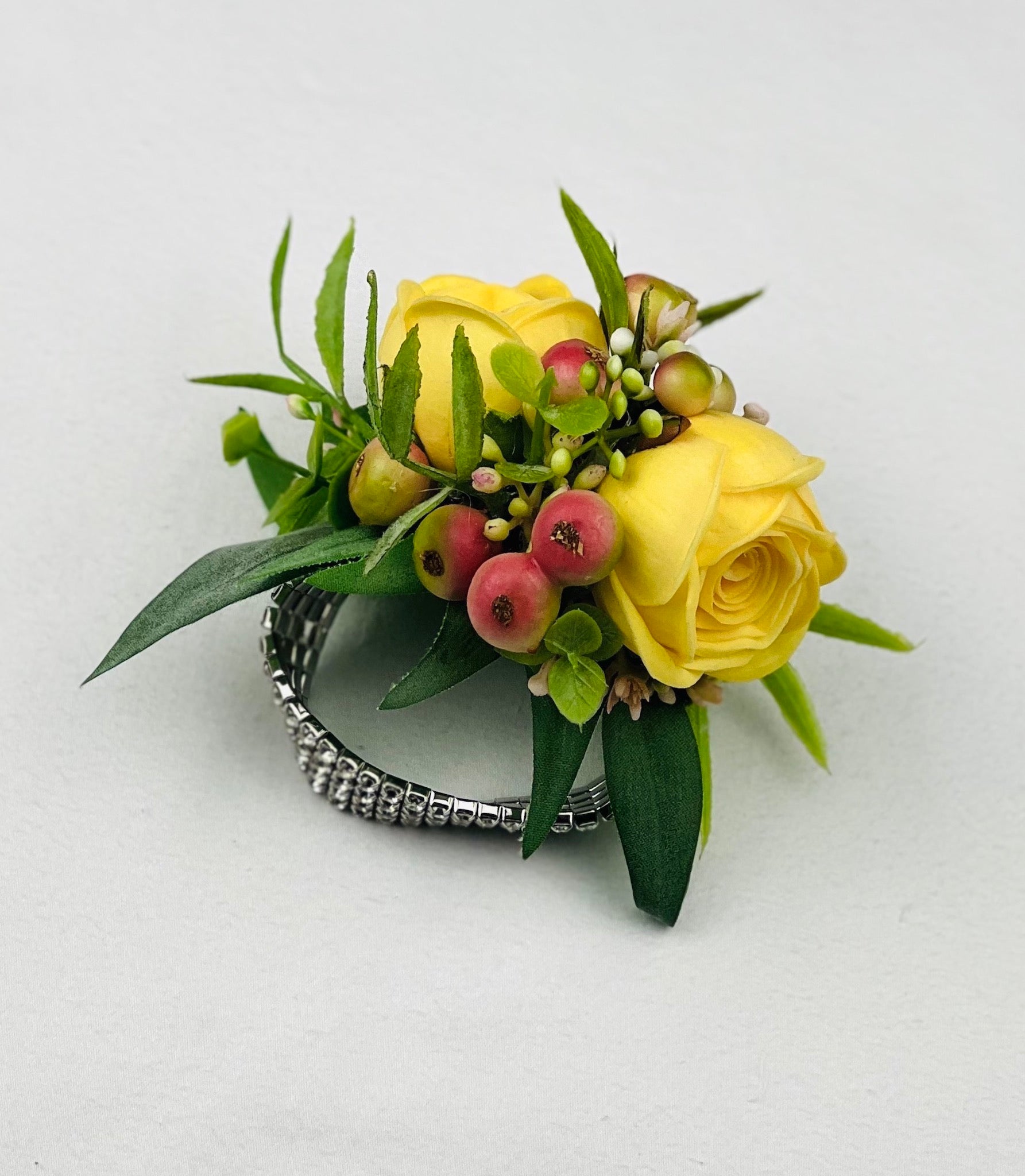 Custom wrist corsage designed just for you to match your dress. Created on a gold or silver cuff bracelet with faux florals and foliage; an excellent keepsake for remembering your special night.