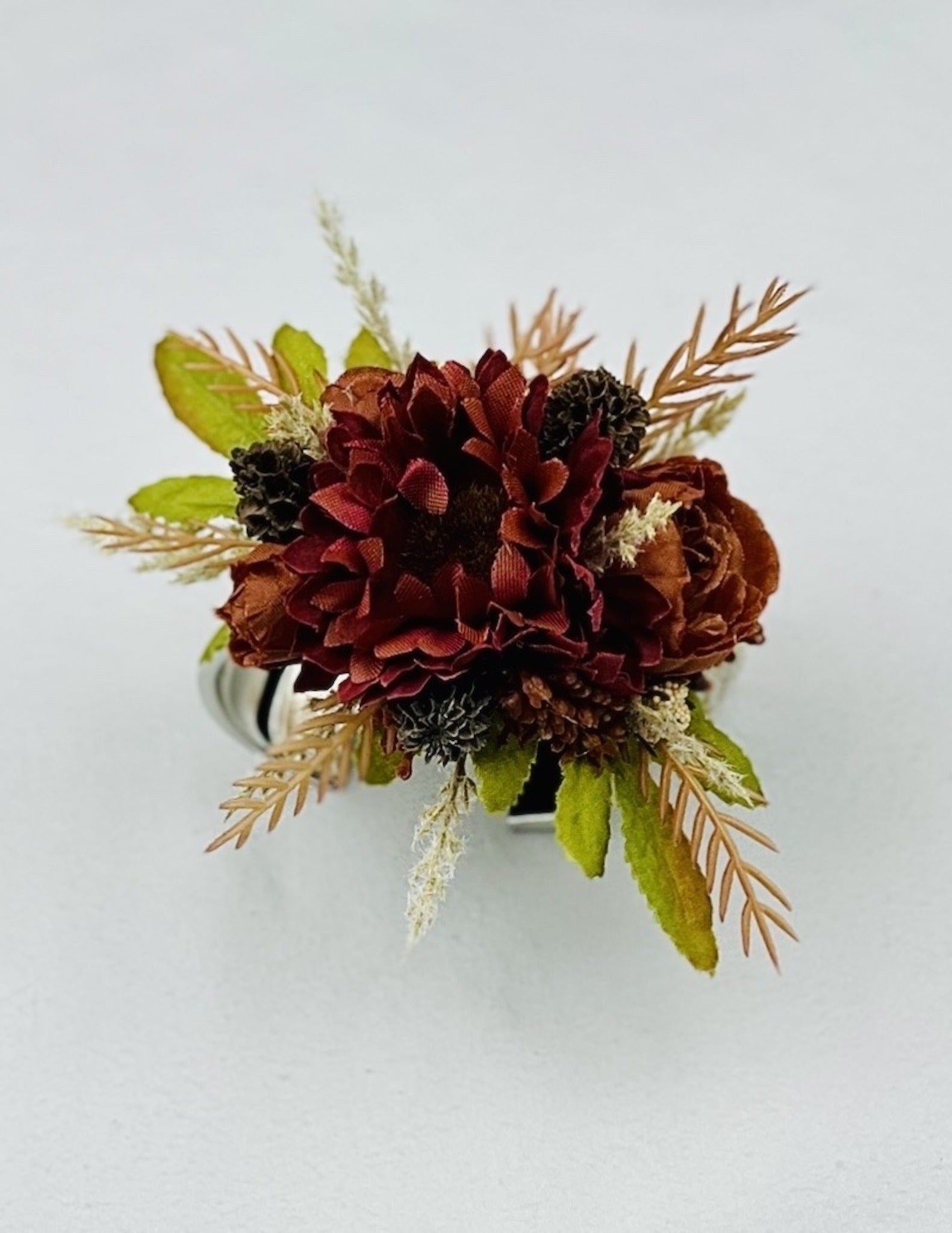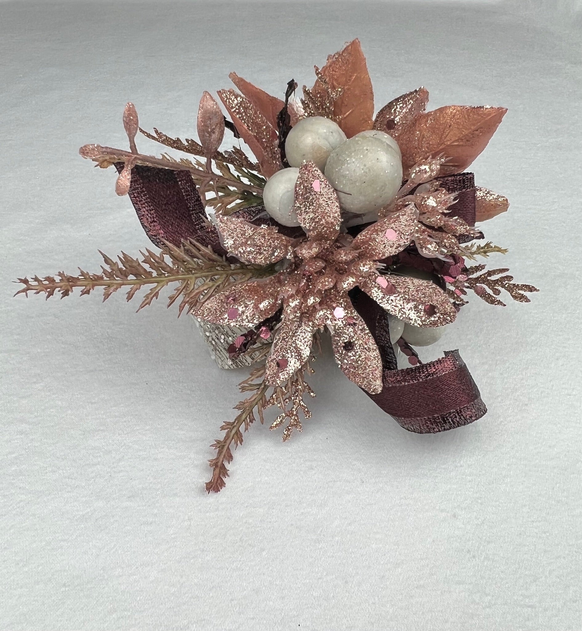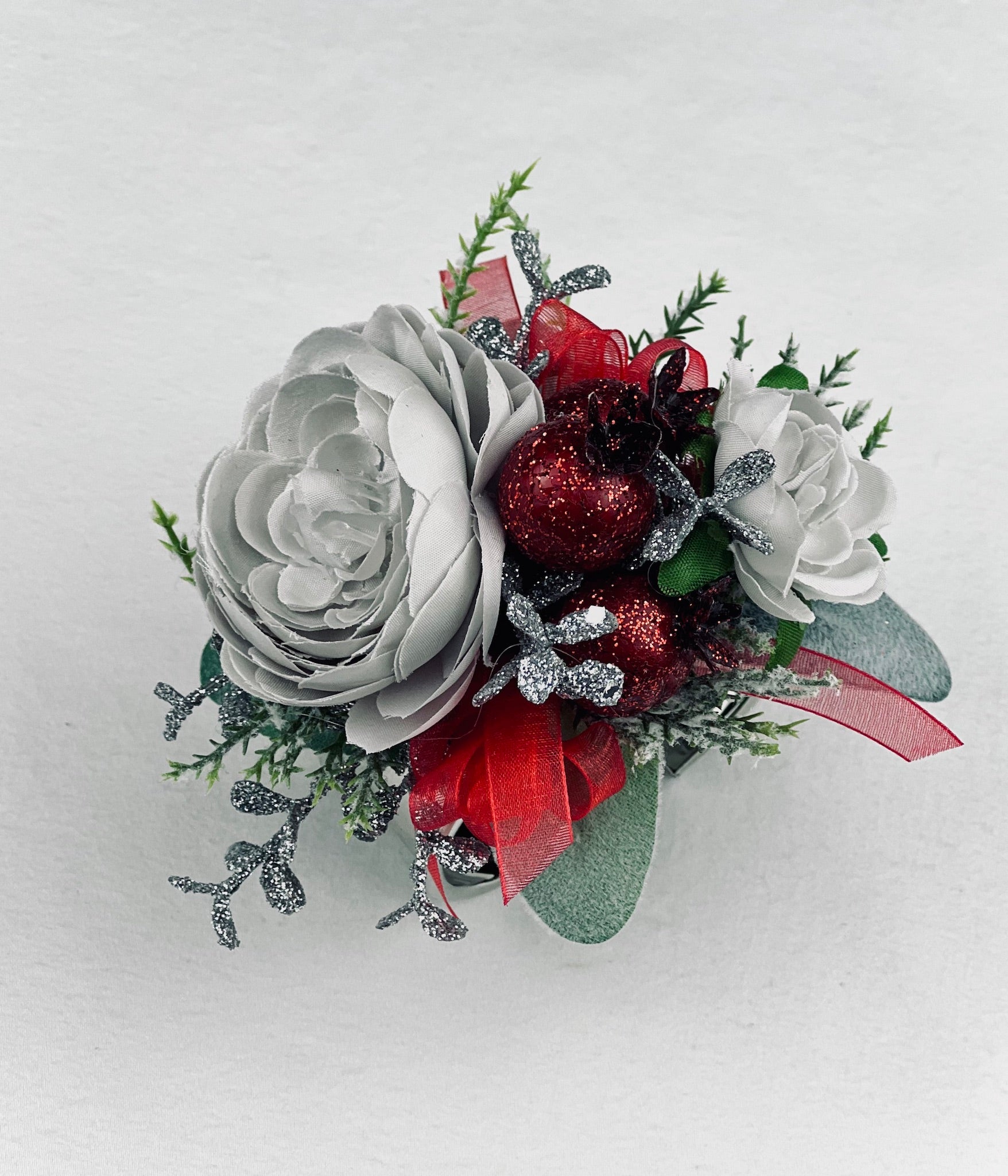 Custom wrist corsage designed just for you to match your dress. Created on a gold or silver cuff bracelet with faux florals and foliage; an excellent keepsake for remembering your special night.