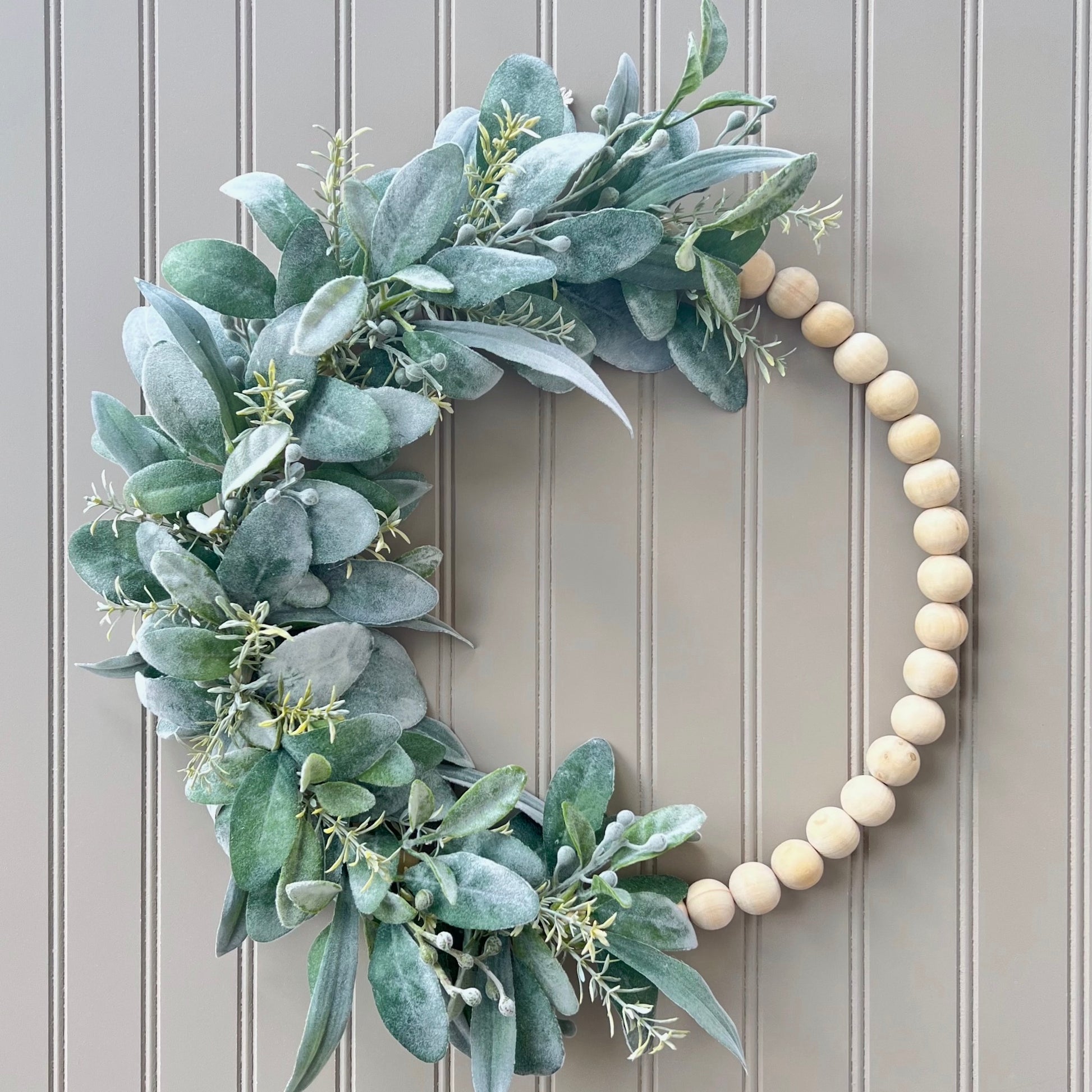 Go green with this modern-style, lambs ear hoop wreath. Enjoy this simple, greenery, wreath featuring lots of texture with its hearty display of velvety lambs ear in mixed green tones, mimosa foliage, tea leaves, and green berries arranged together on a natural color, wood beaded hoop. Perfect for everyday, this wood bead hoop wreath is sized perfect for hanging on your front door or for using as an accent in your favorite room or space.